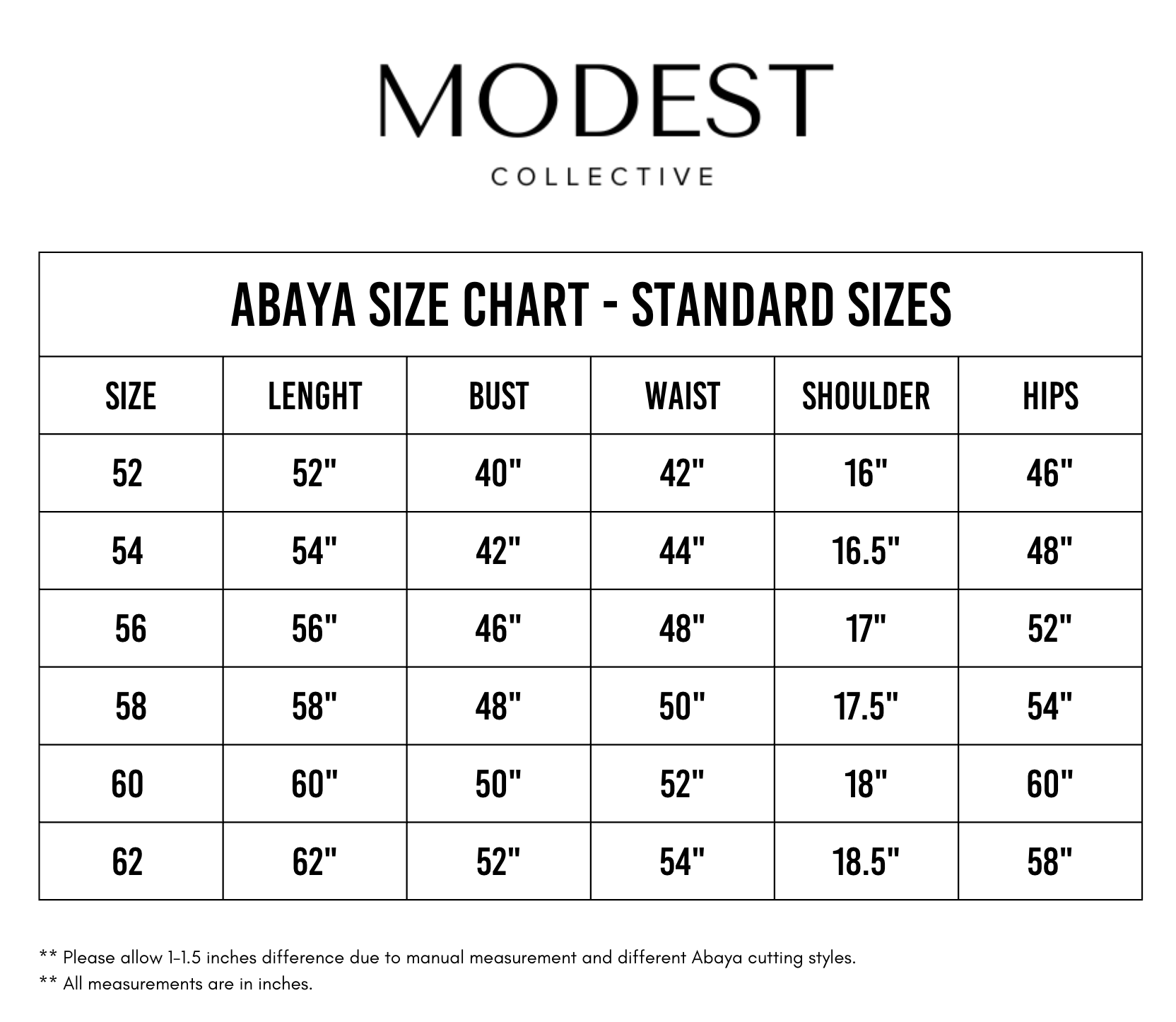 Model is 5'5" (without heels) and wearing this Abaya in a size 56.